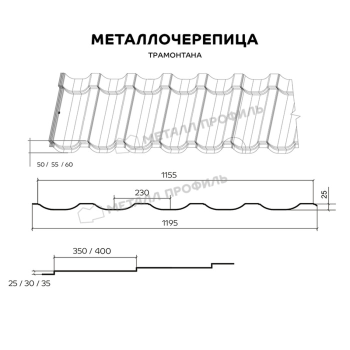 Новый профиль металлочерепицы от Компании Металл Профиль. За счёт многочисленных рёбер жёсткости материал крайне устойчив к порывам ветра и пригоден для эксплуатации даже в самых тяжёлых климатических условиях. Значительная высота профиля (50/55/60 мм на выбор) в тандеме со срезанным гребнем волны выделяют эту металлочерепицу на фоне других. Кроме прочих плюсов новой черепицы, стоит отметить её 100% водонепроницаемость. Она достигается за счёт улучшенной конструкции бокового соединения — две капиллярные канавки не позволяют воде попасть под кровлю. Этому также способствует и чёткая стыковка листов, произведённых на высокоточном европейском оборудовании. Горизонтальный нахлёст стальной черепицы ТРАМОНТАНА незаметен на готовой кровле за счёт обрезки нижней кромки по форме волны. Данная металлочерепица производится с полимерными покрытиями сегментов Премьер и Премиум из ассортимента Компании Металл Профиль. Покрытия имеют разнообразную цветовую гамму, включая оттенки «металлик», а кроме того, впечатляющие технические характеристики, которые обеспечат вам крепкую крышу на долгие годы*.